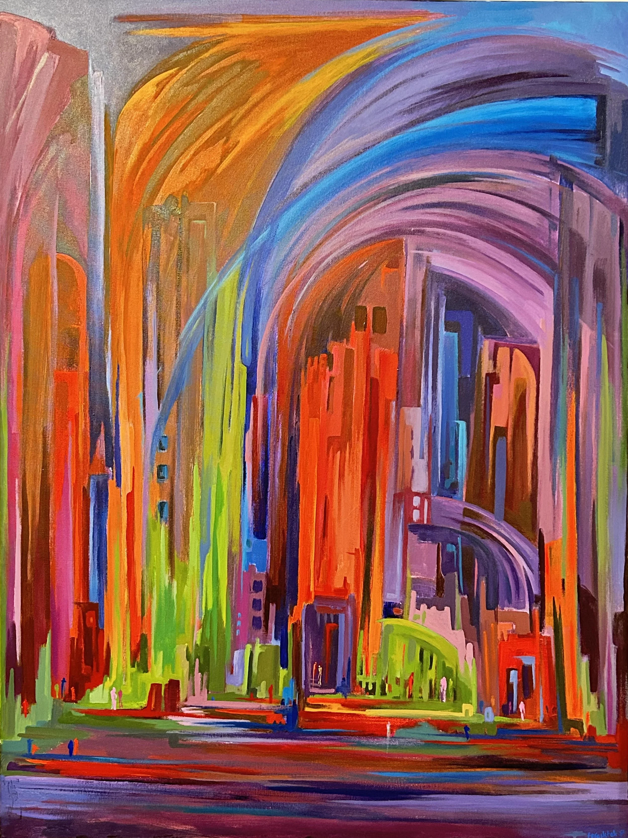 My paintings capture the vibrant atmosphere of Tehran’s traditional bazaar — a place where culture, architecture, and human energy intertwine. I explored the play of light and shadow that brings life to its arched ceilings and narrow pathways. The use of blue and orange reflects the emotional duality of the space: blue for calmness, spirituality, and reflection, and orange for warmth, excitement, and human presence. The small figures within the vast architectural setting emphasize the grandeur and timelessness of the bazaar, reminding us of how human life flows within the monumental beauty of tradition.